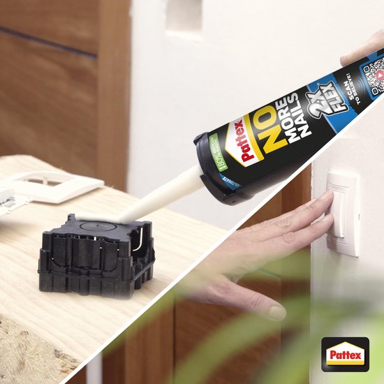 Krachtige verlijmingen binnen en buiten – met Pattex No More Nails Flex Deze multifunctionele Pattex montagelijm is een hoogwaardige combinatie van montagelijm en voegkit en kan voor veel verschillende toepassingen gebruikt worden. De lijm kan bijvoorbeeld worden gebruikt om lijsten of stekkers te verlijmen en werkt zelfs op tijdelijk natte oppervlakken. De constructielijm is ideaal voor de elastische verlijming van verschillende materialen*, zoals ramen, meubels, kinderspeelgoed en meer. De lijm creëert een permanent flexibele, maar krachtige verbinding en is gedurende 10 minuten na het aanbrengen herpositioneerbaar. De waterbestendige lijm is bestand tegen veroudering, UV, weer, schokken en temperaturen van -30°C tot +80°C. De lijmkit kan na het drogen overschilderd worden voor een professionele afwerking. De formule is oplosmiddelvrij en irriteert niet. Aanbevolen materialen*: hout en derivaten, hard PVC, tegels, steen, metalen, glas, decoratieve elementen, geëxpandeerd polyurethaan en meer. Zo werkt het: 1. Zorg dat oppervlakken schoon en droog zijn. 2. Breng de montagelijm aan met een kitpistool en oefen gedurende 15 seconden na aanbrengen van de lijm een sterke druk uit. 3. Breng de lijm aan in druppels of lijnen en druk de oppervlakken stevig tegen elkaar. 4. De oppervlakken zijn na aanbrengen gedurende 10 minuten herpositioneerbaar. 5. De uiteindelijke hechting wordt binnen 24 uur verkregen. De productvoordelen in een oogopslag: - Voor verlijmen en afdichten - Voor binnen- en buitengebruik - Geschikt voor bijna alle materialen* - Gedurende 10 minuten herpositioneerbaar - Bestand tegen veroudering, UV, weer, schokken, water en temperaturen van -30°C tot +80°C - Kleur: wit, beige, zwart, grijs - Formaat: 1x390g koker * Niet geschikt voor PE, PP, PTFE, acryl, koper, messing en zachte PVC.